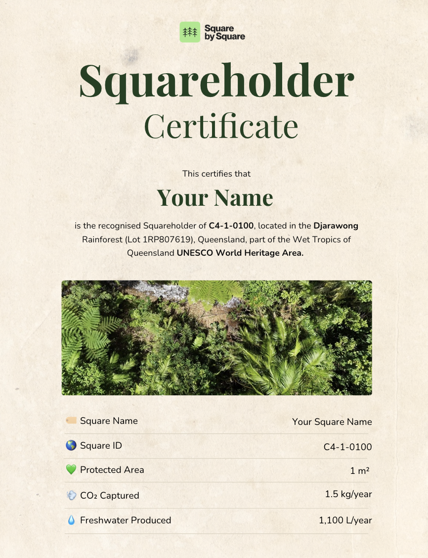 Your Square exists, right now, deep in the Djarawong rainforest, a place you can locate, visit, and watch thrive!